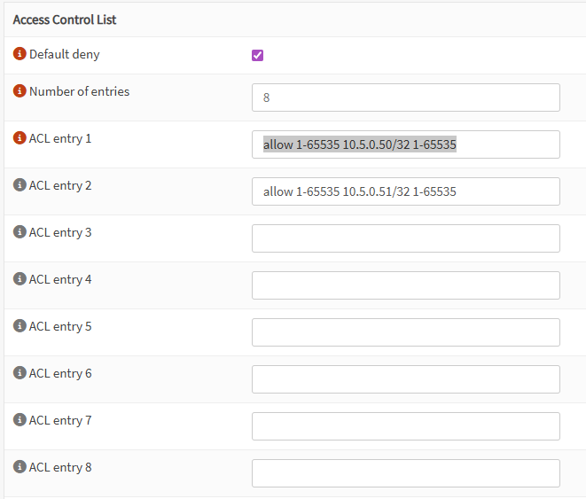 - ACL Entry 1 – Enter allow 1-65535 <IP-ADDRESS>/32 1-65535 Replace <IP-ADDRESS> with the Static IP of your device. Repeat this in the following ACL entries for each device.